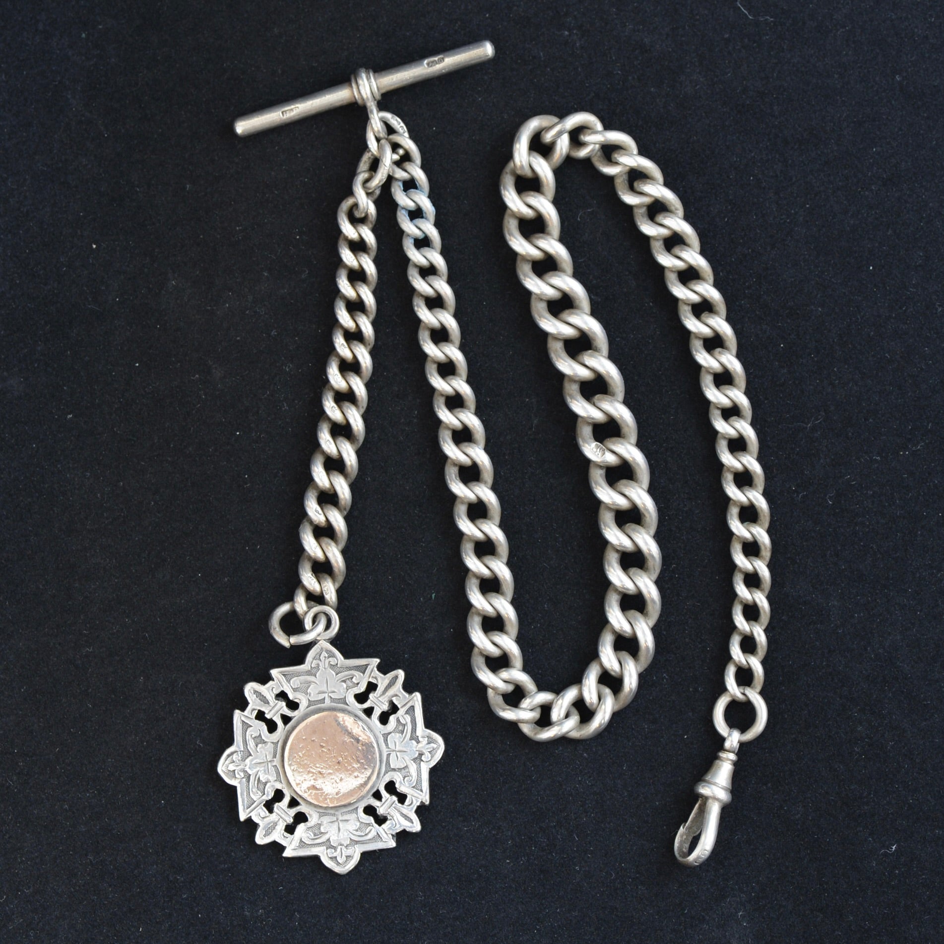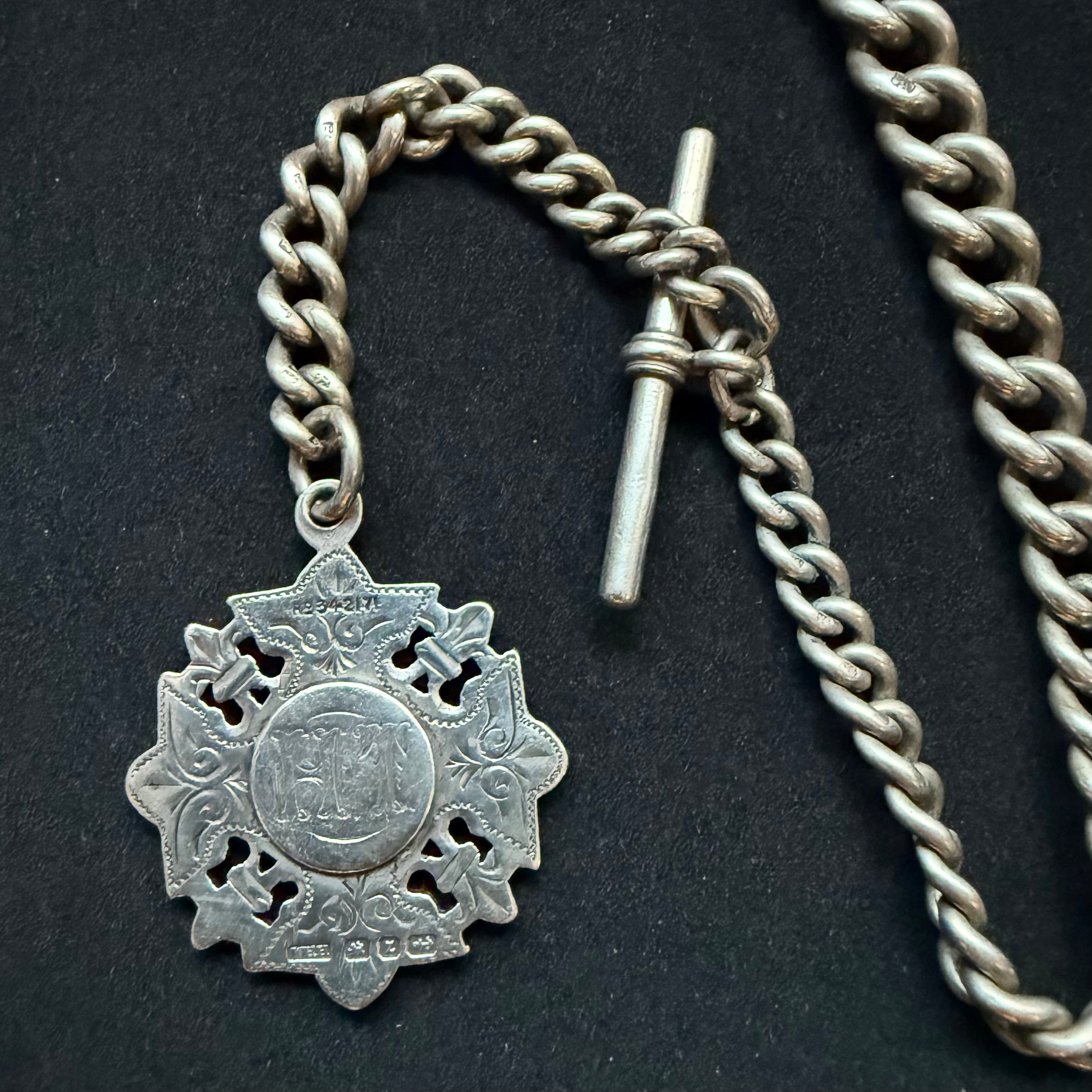 A refined and authentic Victorian-era sterling silver Albert watch chain, distinguished by its elegant pierced fob and pleasingly substantial proportions.