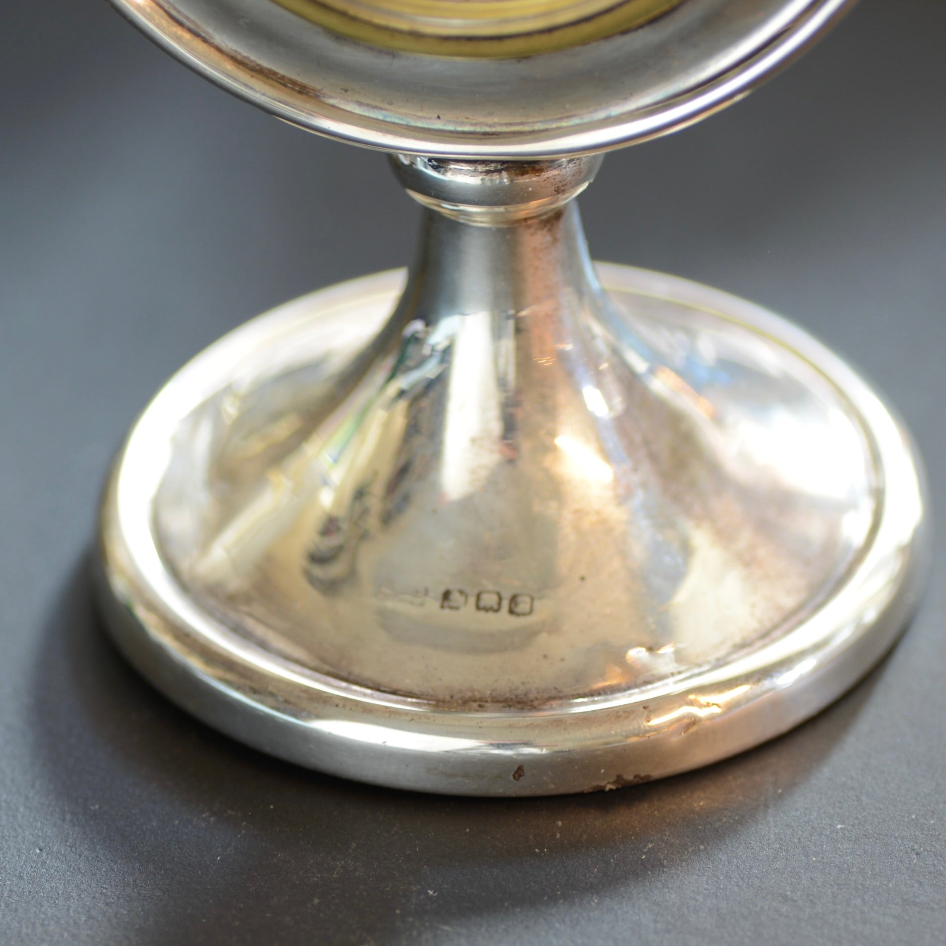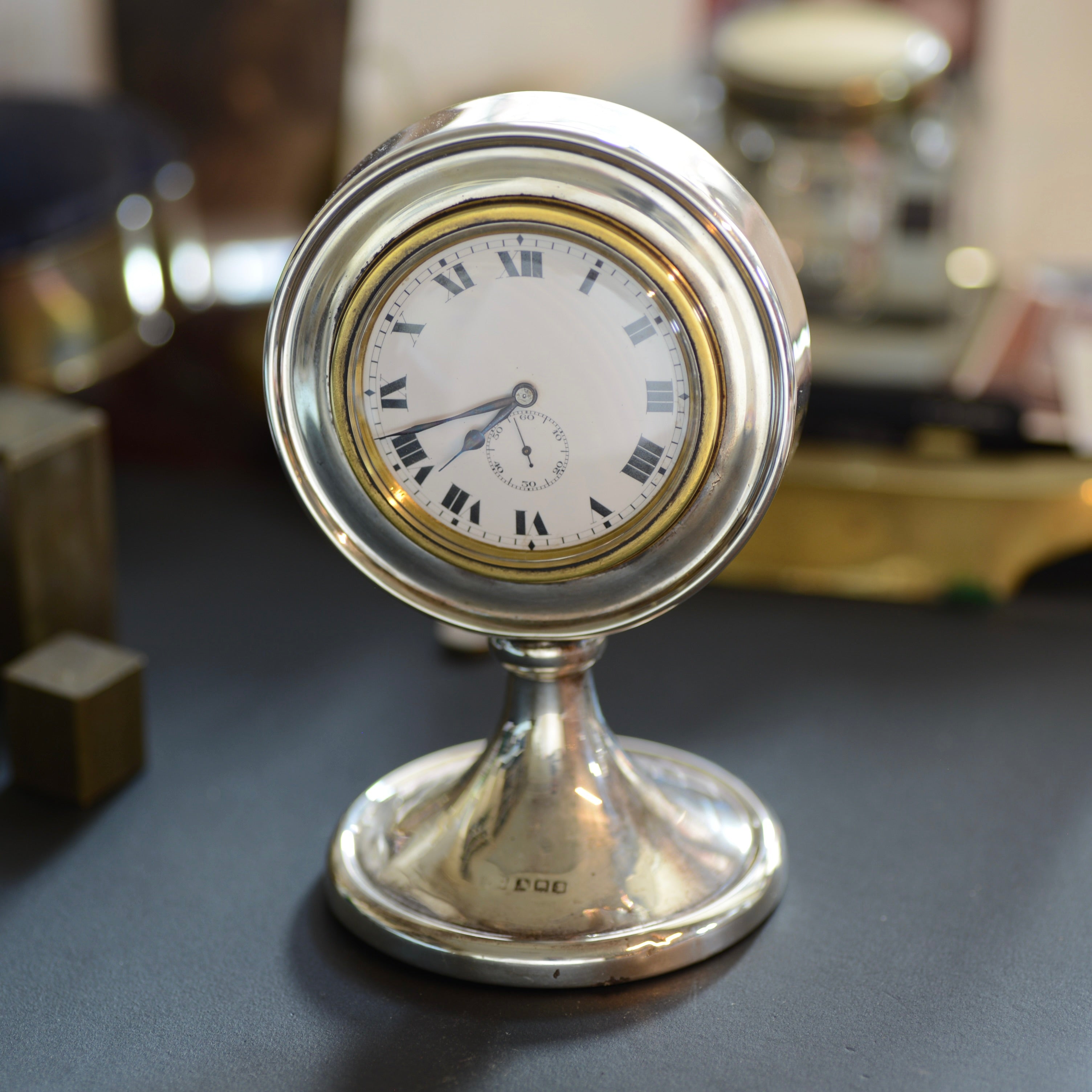 A charming early 20th-century Swiss silver timepiece, this elegant mantel or desk clock combines quality craftsmanship with restrained Edwardian style. The case is of solid silver, hallmarked around the base (marks now softly rubbed but consistent with circa 1910 manufacture). The silver retains an attractive, even patina appropriate to its age.